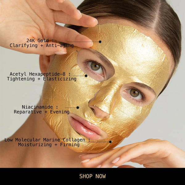 Revitalize your skin and routine with our newly reformulated Sheet Mask Set. Our 24K Gold Hydra Collagen Face Mask, packed with antioxidant-rich ingredients, will lift, firm, and brighten your skin for a luxurious look. Perfect as a stocking stuffer, this innovative two-piece mask promises a revitalized and illuminated appearance.