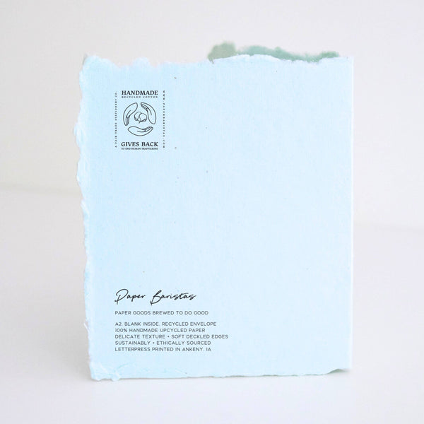 Beautiful paper. Made by beautiful people. For a beautiful cause. (Upcycled + Fair Trade + Gives Back) Our handmade deckled edge paper collection is letterpress printed in-house late at night with lots of coffee. This card is meant to be treasured for years to come. Handmade paper beautiful enough to frame and helps us ensure there was no slave labor in our supply chain. 10% goes to fight for human rights in the supply chain.
