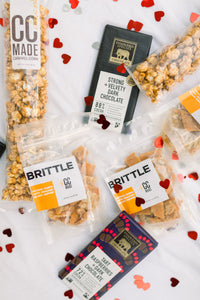 Potato Chip Brittle by CC Made. Buttery, sweet + salty brittle combined with potato chips giving it that perfect crunch. Topped with cracked black pepper + flaky sea salt. Trust us - it’s incredible! (2 oz)