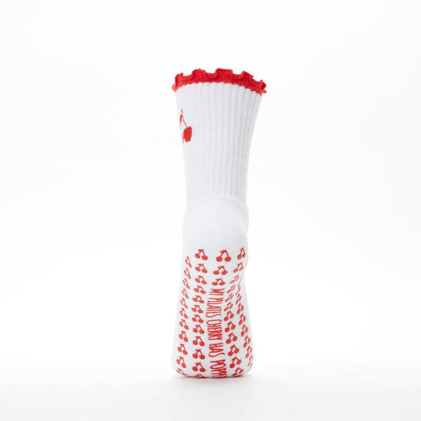 Our grip socks are made with a cushioned sole so you will workout in both comfort and style. Featuring the words "My Pilates Cherry Has Popped" with Cherry Shaped Grips on the sole. One Size fits 36-41 Composition: Poly Cotton Blend